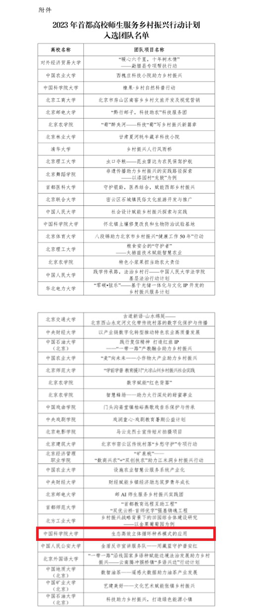 据悉,该项目计划是北京市教工委为深入学习贯彻习近平总书记给中国农业大学科技小院学生重要回信精神,教育引导广大师生发挥智力优势、深入乡村一线,助力乡村振兴,上好特色“大思政课”,推动习近平总书记重要回信精神形成生动实践而设立的。今年,中国科学院大学共3个团队获批。