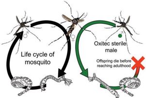 第三种办法则是英国牛津昆虫技术公司(Oxitec)推出的“以蚊灭蚊”计划,即向野外释放用转基因培育出的有精但不育的雄蚊。这种雄蚊的后代体内的一种酶会积累到有毒的浓度,导致幼虫大量死亡。牛津昆虫技术公司的科学主管洛加 奥菲指出,他们的这种转基因蚊子不会对生态系统形成长期的改变,因为它们的寿命很短——只能成活一代,而且没有后代。