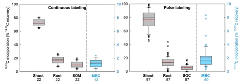 此外,该团队还估算了水稻地下碳输入量和根际沉积碳的数量,发现利用连续标记方法,水稻一个生长季地下碳输入总量为1.58Mg ha-1,其中根际沉积碳占0.42Mg ha-1。而利用脉冲标记方法估算的碳输入量则略低(总地下碳输入,1.37Mg ha-1;根际沉积碳,0.35Mg ha-1)。