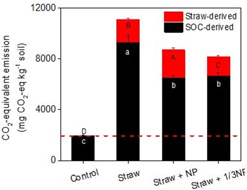 图1 施肥措施对秸秆和土壤有机碳来源的CO2释放当量的影响
