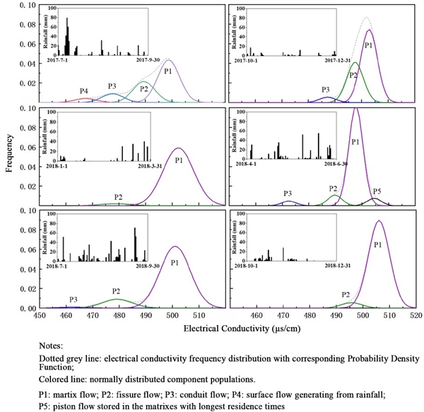 NO3-为示踪剂,将溪流水补给来源概化为土壤和表层岩溶带两种储水介质,应用二元混合模型,发现表层岩溶带是溪流水的最重要补给来源。次降雨事件中,土壤水对溪流水的贡献量最大仅有16.8%;而在年尺度,土壤水平均供水量为1.4%。将表层岩溶带进一步细分为管道、裂隙、基质,根据水流在三种导水介质中的滞留时间不同而引起的电导率值的差异,应用电导率频率分布(CFD)方法,发现由于小流域岩溶化发育程度较低,基质流均是溪流水最主要的补给来源(旱季>80%、雨季>55%),但管道在小流域富水阶段也是重要的排水通道(最大10%-15%)。