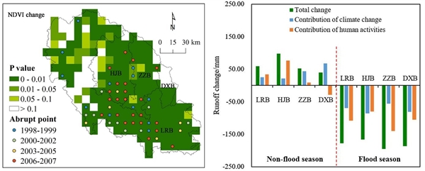 1985—2015龙江流域植被变化(左)及气候变化和人类活动对季节尺度径流变化的贡献(右)