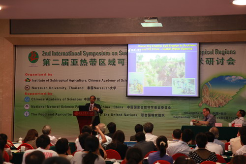 9月16日,中国科学院亚热带农业生态研究所和泰国Naresuan大学共同举办,中国科学院国际合作局、国家自然科学基金委和联合国粮农组织联合资助的第二届亚热带区域可持续农业国际学术研讨会在长沙隆重召开。来自法国、澳大利亚、菲律宾、印度、泰国和中国等相关研究机构和国际组织的150余名代表出席。泰国Naresuan大学农学院院长Chanin Umpornsatil博士、中国科学院亚热带农业生态研究所所长王克林研究员和湖南省科技厅副厅长杨治平分别在开幕式上致辞。中国工程院院士南志标、国际作物研究所Suhas Wani博士、国际食品政策研究所Kevin Chen博士应邀作大会主旨报告。