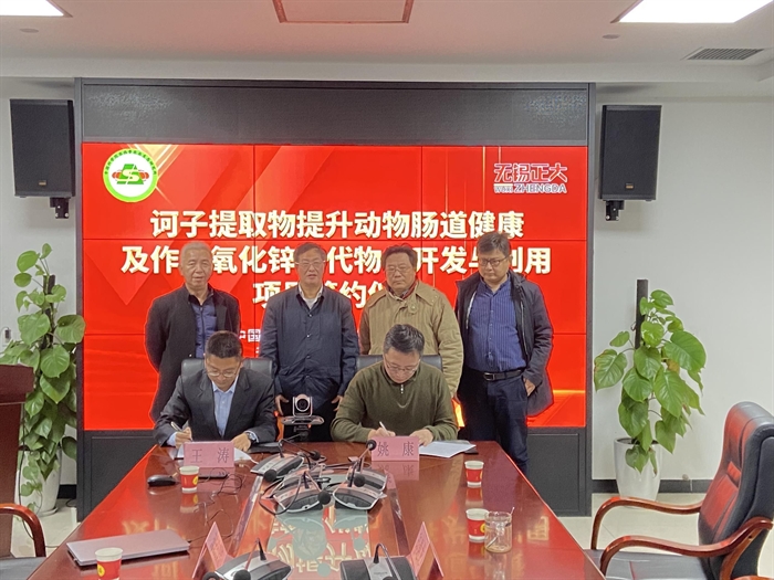 会上,公司技术总监王涛介绍了该公司在植物提取物尤其是诃子的研发进展及其在畜牧行业的推广应用现状。与会人员针对相关研究工作提出了改进建议,表示研究所将全力支持公司在植物提取物方面的研发工作。随后,姚康与王涛代表双方正式签约。本次合作将共同解决饲用氧化锌替代难题,推动畜牧业绿色可持续发展。