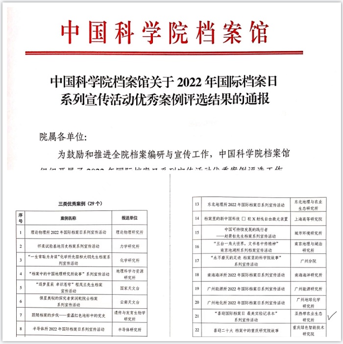 近日,中国科学院档案馆发布《关于2022年国际档案日系列宣传活动优秀案例评选结果的通报》,中国科学院亚热带农业生态研究所组织开展的《喜迎国际档案日 最美实验记录本》系列宣传活动荣获“三类优秀案例”。