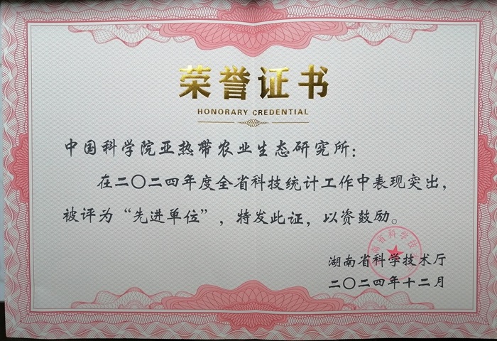 亚热带生态所荣获2024年度科技统计工作先进单位称号